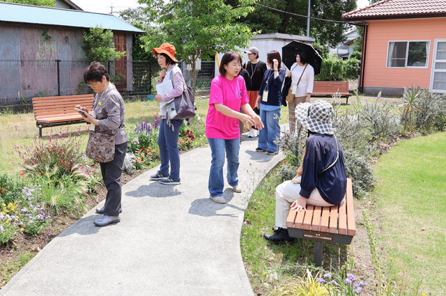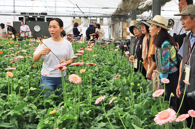 式典は約470人、交流会は100人、翌日の現地見学会は50人が参加しました。見学会は2コースに分かれて、市民主体で築かれた花のまちづくりの活動拠点地「女神花壇」「せせらぎガーデン」「いろ葉の庭」「萩間小学校」などを見学したほか、多彩で高い品質を誇る花卉圃場「ガーベラハウス」「トルコギキョウハウス」、花の名所「秋葉公園」「大鐘家」などを巡り、充実の見学会となりました。